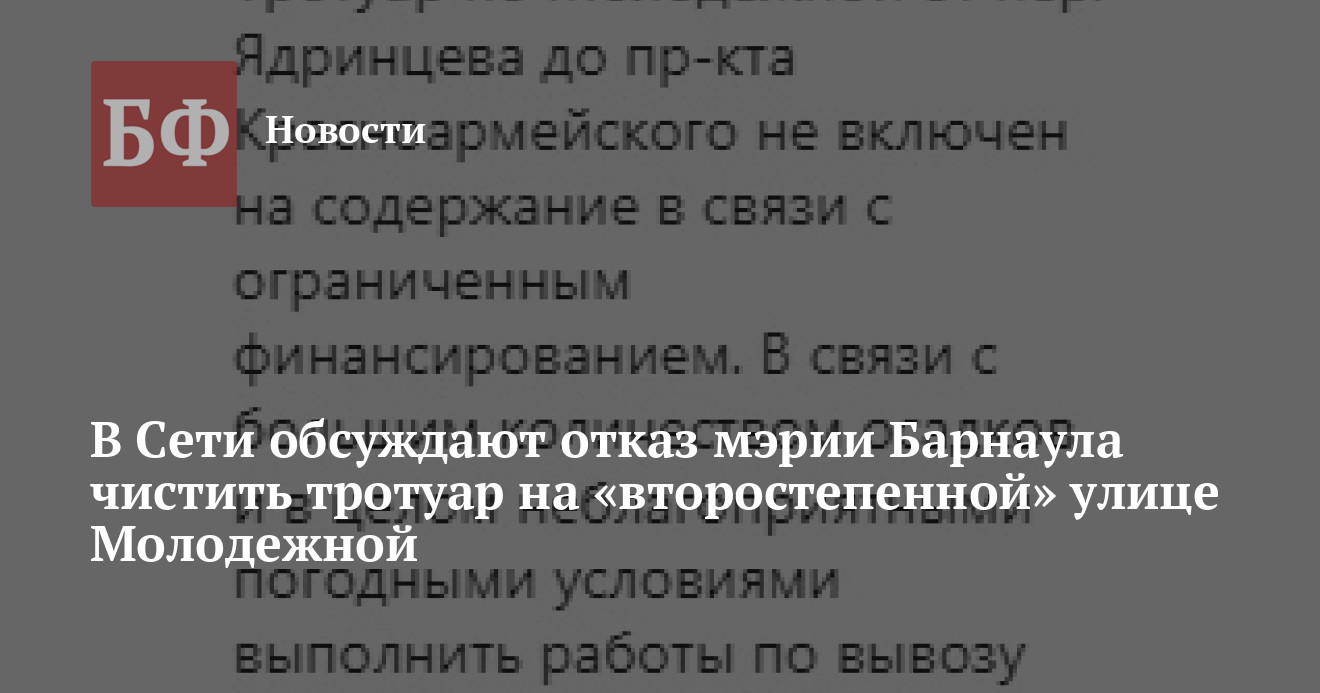 Несколькими днями ранее на странице губернатора Алтайского края Виктора Томенко в Instagram жительница Барнаула Светлана Борисова пожаловалась на то, что специализированные службы не очищают от снега тротуар на улице Молодежной от проспекта Красноармейского до переулка Ядринцева. К тому же с дорог снег просто сгребают к краям, вместо того, чтобы его вывозить. Она отмечала, что ходить по улице становится тяжело даже здоровым молодым людям, не говоря о стариках и инвалидах. Горожанка даже пыталась обращаться в администрацию Железнодорожного района и городской комитет по дорожному хозяйству, благоустройству, транспорту и связи, но так и не дождалась ответа.