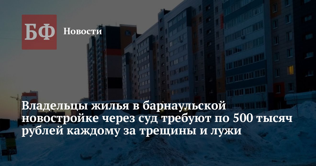 Октябрьский районный суд Барнаула рассмотрит исковое заявление Алтайской краевой региональной общественной организации по защите прав потребителей «Солидарность», поданное в защиту интересов жильцов многоквартирного дома по улице Сергея Ускова, 31. Собственники квартир в течение пяти лет после ввода дома в эксплуатацию наблюдают за тем, как здание разрушается, при этом застройщик якобы не желает исправлять допущенные огрехи. Организация в интересах собственников потребовала устранить многочисленные нарушения и выплатить им по 500 тысяч рублей компенсации каждому.