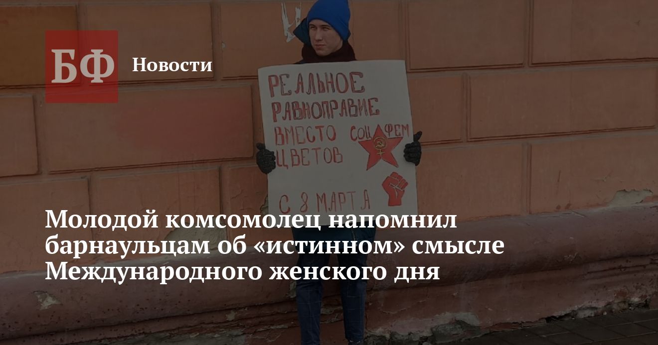 Активист Барнаульского отделения ЛКСМ Ален Бояринов провел одиночный пикет с целью напомнить горожанам о том, какая дата на самом деле отмечается 8 марта Об этом сообщается в сообществе реготделения организации «ВКонтакте». Сам комсомолец рассказал ИА «Банкфакс», что многие проходившие мимо женщины его поддержали.