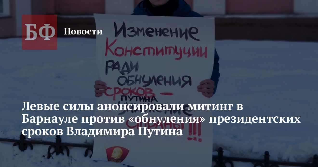 В Барнауле может пройти митинг против поправки к Конституции от депутата Госдумы Валентины Терешковой (ЕР) об «обнулении» президентских сроков, которая, при определенных обстоятельствах, может позволить действующему главе государства Владимиру Путину баллотироваться на выборах в 2024 году и, возможно, в 2030 году. Массовую акцию анонсировал персек крайкома комсомола Антон Арцибашев, который 11 марта уже вышел на одиночный пикет против поправки, сообщается в сообществе реготделения «ВКонтакте».