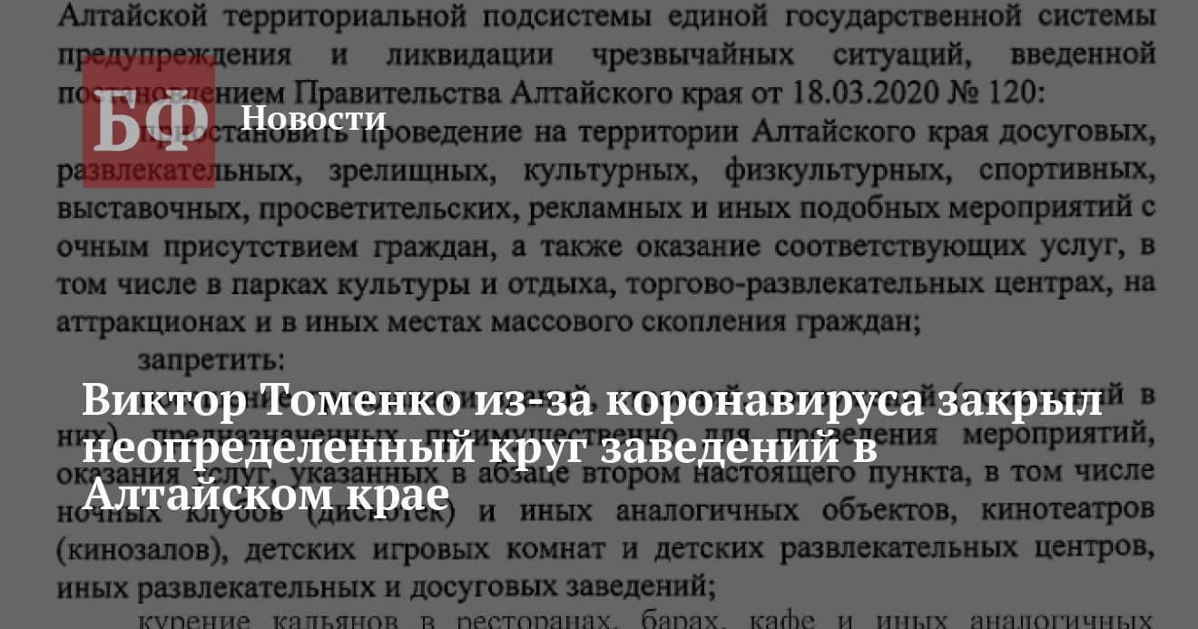 Губернатор Алтайского края Виктор Томенко во исполнение поручения федерального правительства подписал указ, который запрещает проведение досуговых, зрелищных, культурных и других мероприятий в регионе, а также ограничивает доступ в здания, где оказываются подобного рода услуги. Все это предпринимается ради предупреждения завоза и распространения коронавируса. Однако формулировки в документе не позволяют сделать однозначный вывод, какие именно заведения в крае должны закрыться.