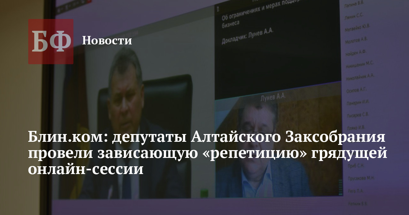 Депутаты Алтайского Заксобрания 17 апреля провели «репетицию» предстоящей сессии, которая должна пройти в удаленном режиме при помощи системы видеоконференцсвязи. Итоги такой проверки некоторые народные избранники посчитали неудовлетворительными: обсуждения и доклады постоянно обрывались из-за сбоев в работе программного обеспечения или канала доступа к Сети. По мнению целого ряда депутатов, после теста стало ясно, что проводить сессию в таком формате просто не представляется возможным.