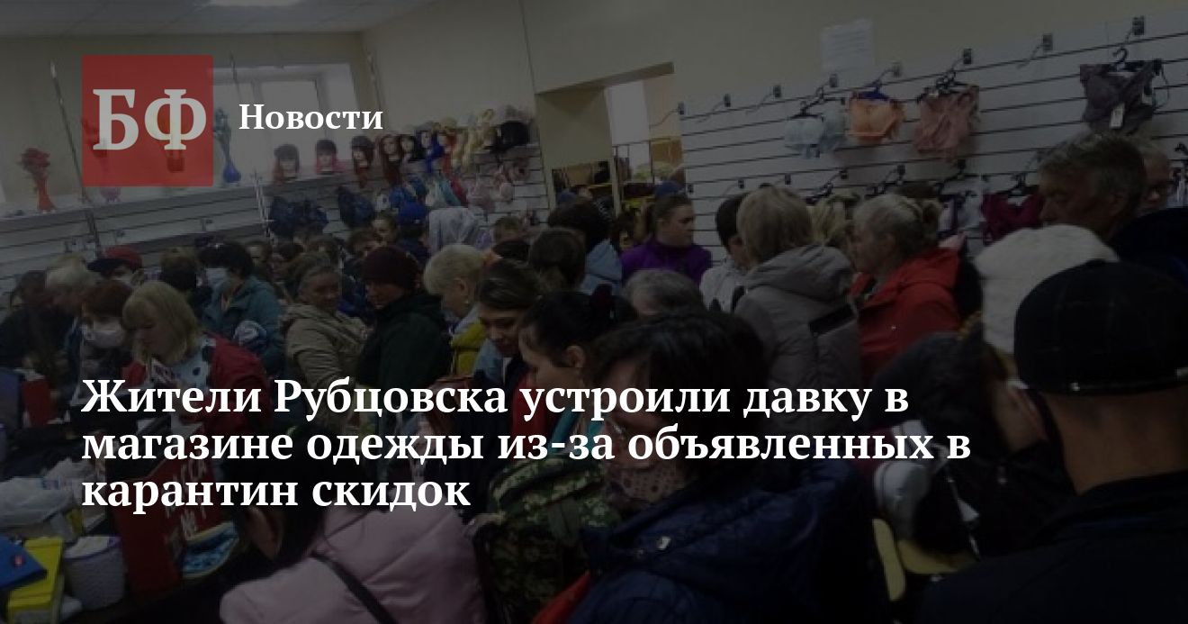 В минувшие праздничные дни в одном из торговых центров Рубцовска, несмотря на пандемию коронавируса, образовался значительный наплыв посетителей, что даже привело к давке. Причиной тому стали объявленные магазином 50-процентные скидки, сообщила в Telegram депутат Алтайского Заксобрания, первый секретарь Рубцовского горкома КПРФ Вероника Лапина. Пока неизвестно, как отреагировали на данную информацию в Управлении Роспотребнадзора по Алтайскому краю. Между тем и другие жители региона сознательно нарушают режим самоизоляции, не обращая внимания на введенные запреты.