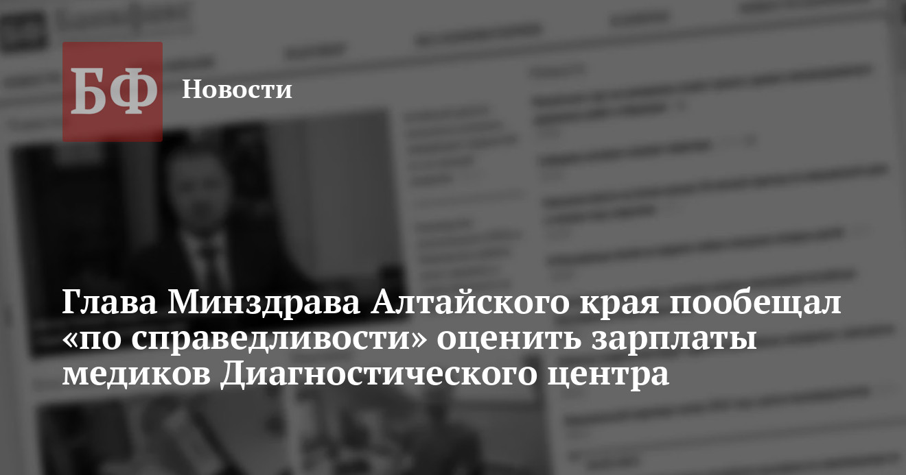 Министр здравоохранения Алтайского края Дмитрий Попов в ходе встречи с сотрудниками регионального Диагностического центра 17 июня пообещал оценить зарплаты медиков, которые последние два месяца получают суммы, приблизительно равные МРОТ. В частности, он намерен проверить их «справедливость». Об этом пишет портал «Амител».