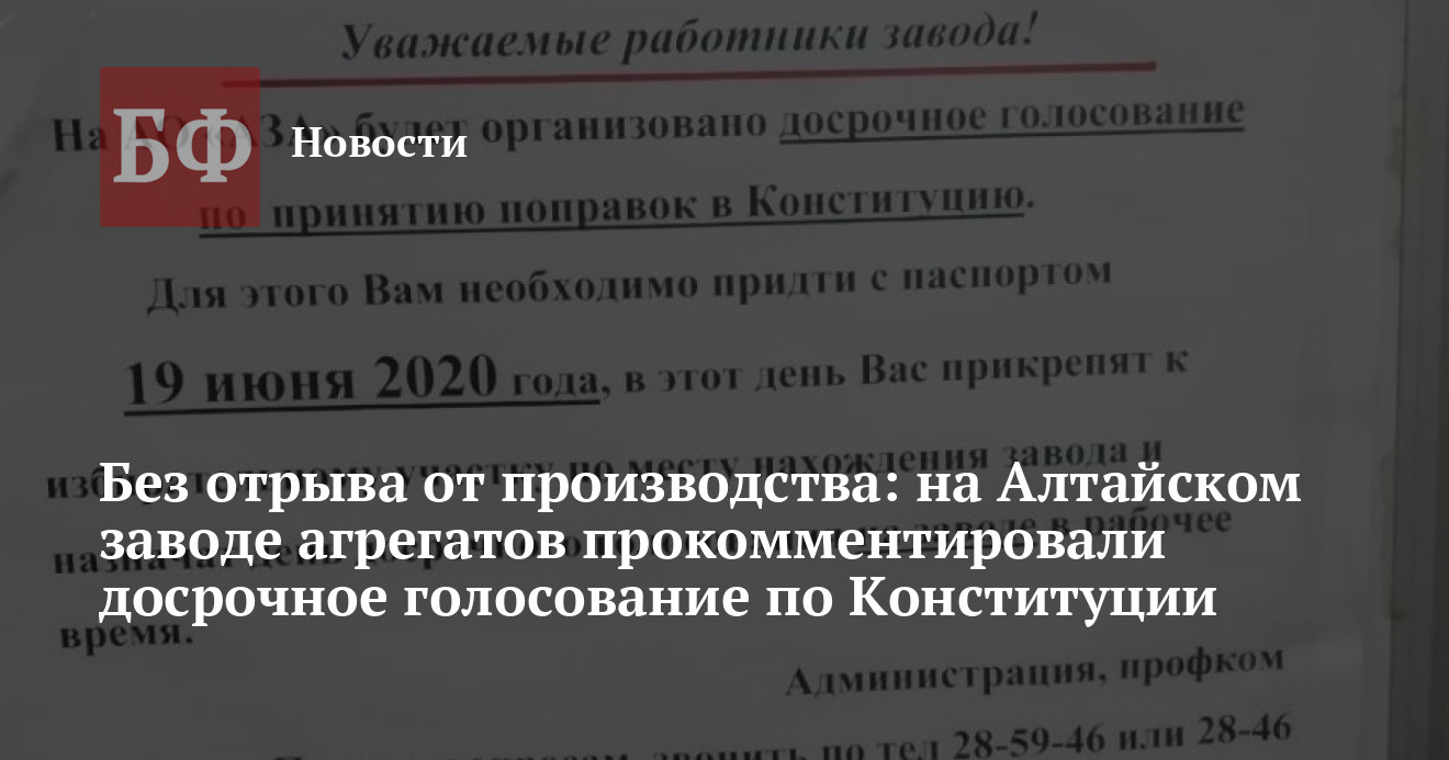 Сотрудникам АО «Алтайский завод агрегатов» (АЗА) предлагают досрочно проголосовать по поправкам в Конституцию РФ, причем на территории самого предприятия в рабочее время. Соответствующее внутреннее объявление для работников опубликовал Telegram-канал «Алтайские крайности», предположив, что таким образом на них оказывается давление. Гендиректор АЗА Вячеслав Кривашин не стал комментировать ситуацию «Банкфаксу», зато в профкоме пояснили, что процедура добровольная и проводится для удобства самих заводчан.