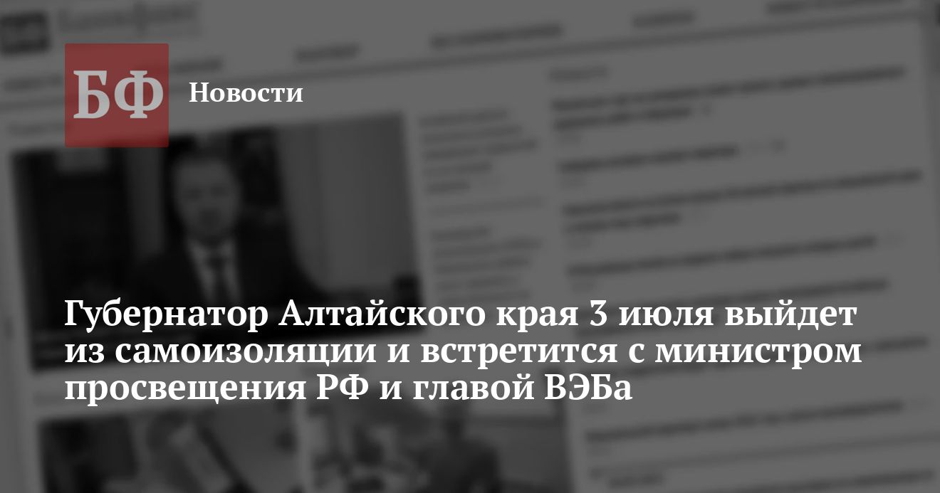 3 июля у губернатора Алтайского края Виктора Томенко заканчивается период самоизоляции, и он выходит на работу. Это следует из официального ответа его пресс-секретаря Дмитрия Негреева на запрос ИА «Банкфакс». Глава региона в первый же день работы отправится на встречи с министром просвещения России и председателем госкорпорации развития «ВЭБ.РФ» Игорем Шуваловым, которые посетят Алтайский край.