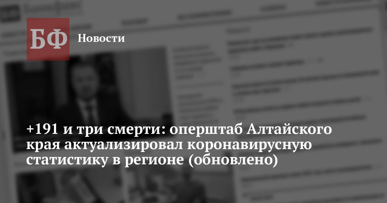 За прошедшие сутки в Алтайском крае выявлено 191 инфицированных, зарегистрировано три смертельных случая, один из них — от COVID-19, сообщает оперативный штаб по региону. При этом выздоровело 124 пациента.