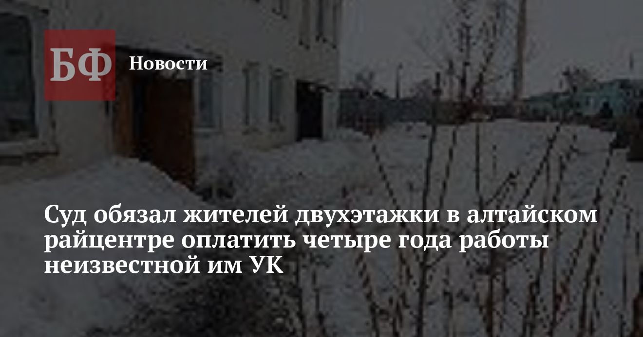 В райцентре Усть-Калманка жильцы двухэтажного многоквартирного дома по улице Алтайской, 25 оказались в непростой ситуации. В начале года суд обязал собственников квартир выплатить от 13 тысяч до 18 тысяч рублей в пользу ООО «Управляющая компания» в счет долга за многолетнее обслуживание их дома. Однако сами граждане сообщили ИА «Банкфакс», что никакого договора с этой компанией они никогда не заключали, и более того, ни разу не видели в лицо ни одного из сотрудников данной УК. Соответственно и работы на доме, по их словам, не проводились. Однако все надзорные ведомства, куда жильцы обращались с жалобами, а также суд встали на сторону компании, поскольку та смогла предоставить доказательства оказанных собственникам услуг, а также своего права на обслуживание данного дома. В УК пояснили, что четыре года не оповещали жильцов о своем присутствии, так как надеялись, что они начнут платить — правда, неясно, как собственники вообще могли выяснить наличие долга.