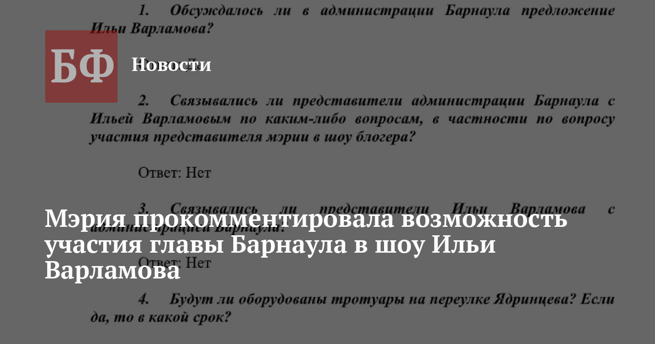 Как уже сообщалось, между пиарщиками мэрии Барнаула и Ильей Варламовым состоялся заочный диалог по поводу ремонта дороги в переулке Ядринцева. Блогер озвучил мнение местных жителей, которые после укладки нового асфальта начали жаловаться на активизировавшихся гонщиков и нехватку тротуаров. Мэрия ответила на критику посредством своего официального Telegram-канала, предложив Варламову лично посмотреть на результат проведенных ремонтных работ. Сам урбанист оказался не против посетить Барнаул и пригласил главу города поучаствовать в его шоу «БДСМ», в котором блогер прогуливается с градоначальниками и обсуждает насущные проблемы благоустройства, организации общественных пространств и градостроительной политики.