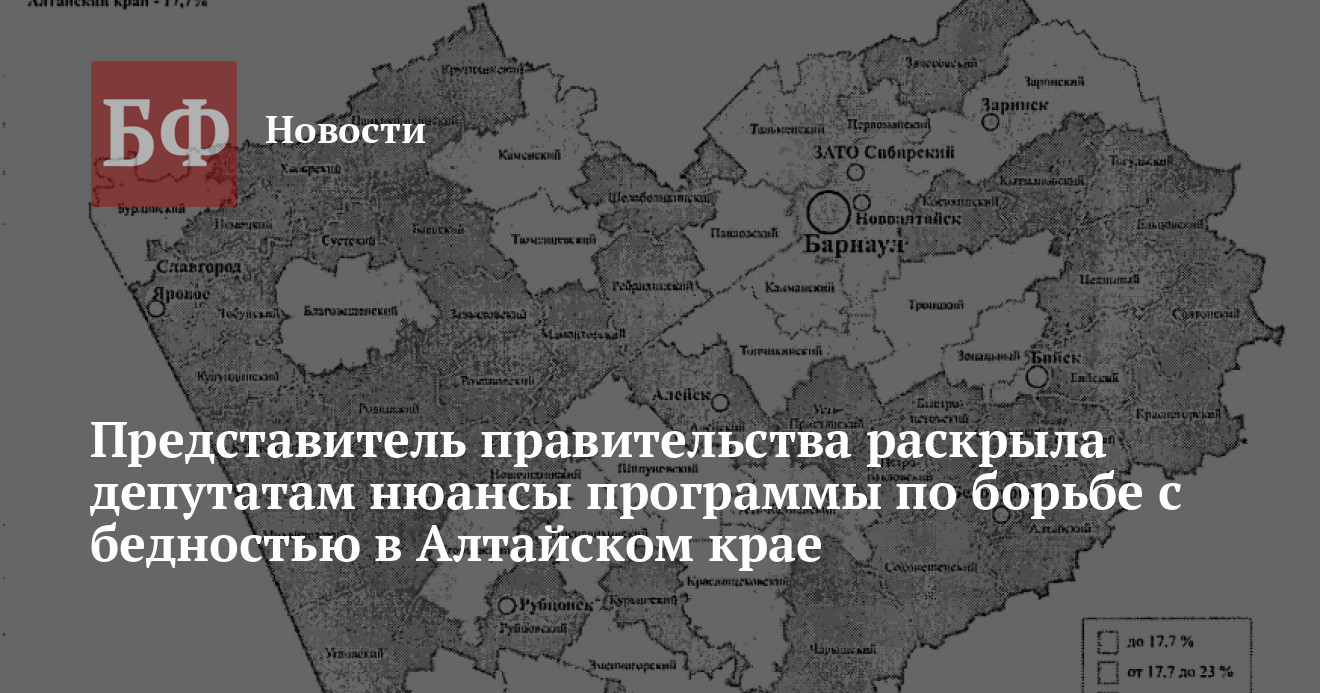 25 августа состоялось заседание комитета по социальной политике АКЗС, на котором начальник Управления по труду и занятости региона Надежда Капура за 10 минут представила депутатам масштабный проект краевой программы по борьбе с бедностью. Она заявила, что главной его целью разработчики видят двукратное снижение уровня малообеспеченного населения уже через 10 лет, а также устойчивый рост доходов граждан. Чиновница доложила, что на данный момент более 17% жителей Алтайского края живут за чертой бедности и имеют доходы ниже прожиточного минимума, однако власти уверены, что данная ситуация поправима. Точкой отсчета для борьбы с бедностью стали показатели 2017 года, но по данным, представленным на сайте управления в официальном документе проекта, в 2019 году ситуация еще более усугубилась — количество бедных в регионе только выросло.