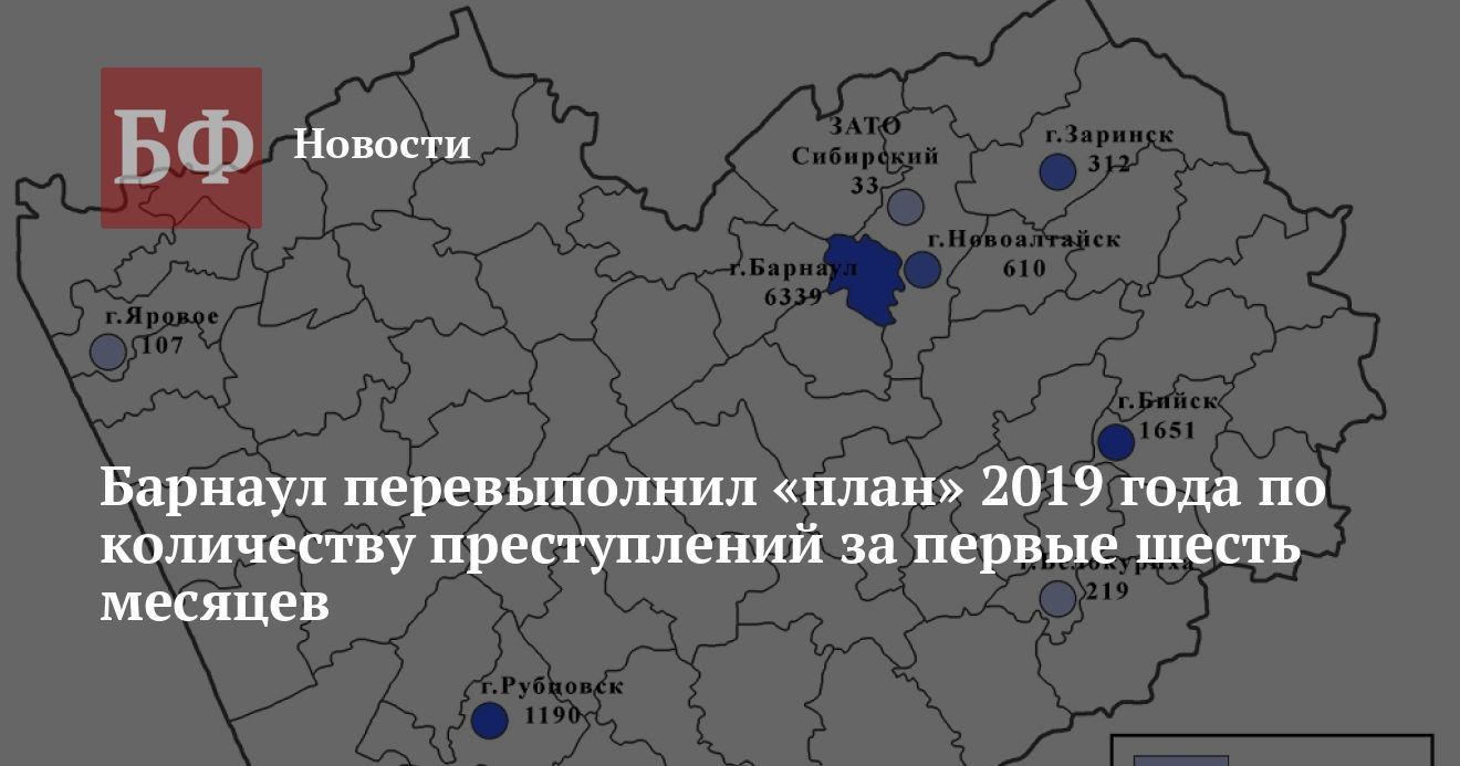 Относительно городов вопрос преступности в районах стоит менее остро. При этом Алейский (375 нарушений закона), Первомайский (360), Каменский (342), Славгородский (301) и Тальменский (297) районы являются лидерами по количеству преступлений. Также стоит добавить, что среди всех муниципалитетов наименьшее число правонарушений происходит в ЗАТО Сибирский. За январь-июнь 2020 года здесь было зафиксировано 33 случая, а в 2019 — 36.