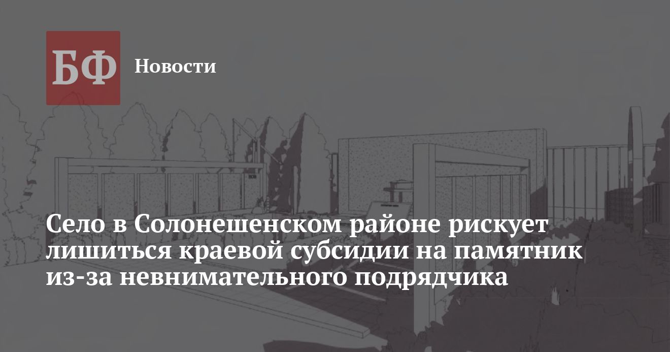 В поселке Первомайском Солонешенского района оказалось под угрозой срыва строительство памятника советской деревне, которое инициировали граждане, а значительную часть средств выделил край. Как рассказали «Банкфаксу» в администрации Лютаевского сельсовета, подрядчик взялся за контракт на 1,4 млн рублей, который он просто не может выполнить. Если строительство не будет завершено, сельсовет не только потеряет краевую субсидию, но и лишится права рассчитывать на подобную помощь на ближайшие несколько лет.