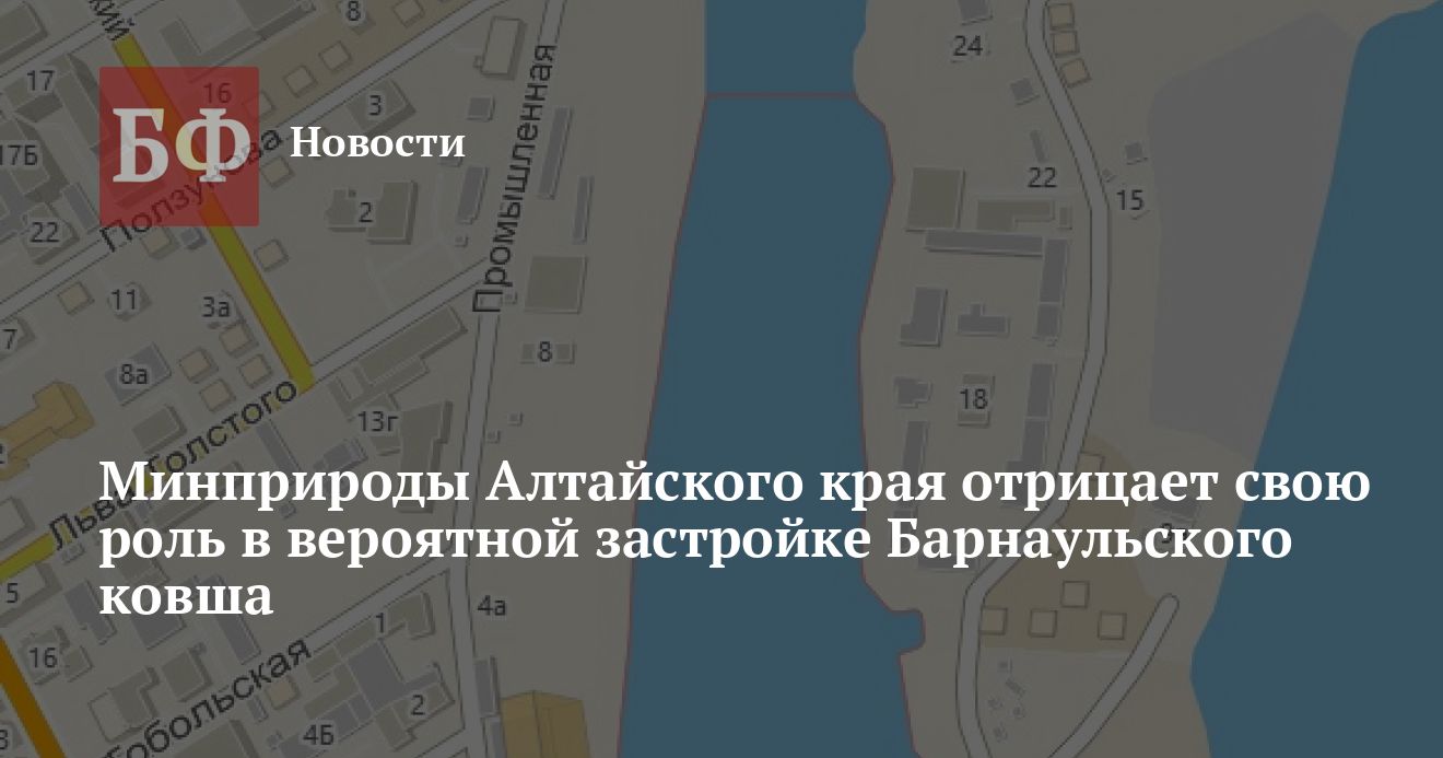 Министерство природных ресурсов и экологии Алтайского края не принимает никакого участие в судьбе так называемого Барнаульского ковша и земельных участков на его берегах, которые, по некоторым сведениям, вскоре могут застроить. Это следует из ответа и.о. руководителя ведомства Ларисы Беребердиной на запрос ИА «Банкфакс». В документе указано, что ситуация находится в плоскости полномочий федеральных и местных органов власти, но не краевых. Однако, по некоторым данным, именно министерство может быть заинтересовано в «освоении» ковша.