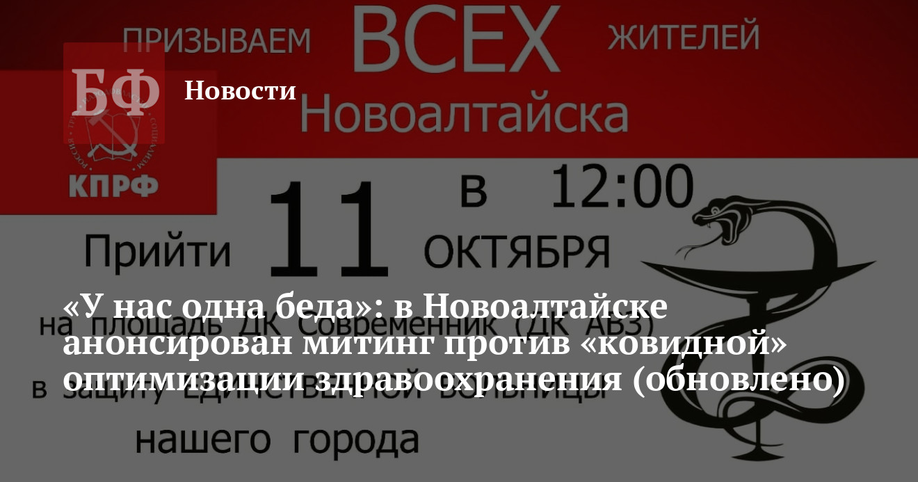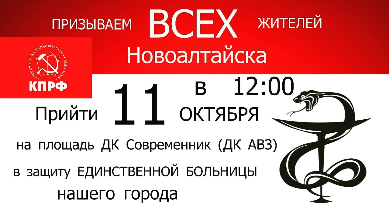 Предполагается, что акция в защиту единственной больницы Новоалтайска состоится в 12:00 11 октября на городской площади ДК «Современник». Коммунист Дмитрий Гришин призвал горожан и неравнодушных жителей Алтайского края, а также других депутатов горсобрания, причем независимо от партийной принадлежности, присоединиться к митингу. Также приглашение получили парламентарии Алтайского Заксобрания, в том числе персек крайкома КПРФ Мария Прусакова.