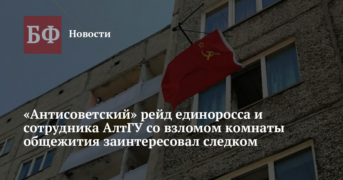 Ранее в редакцию «Банкфакса» поступило анонимное письмо с указанием на предполагаемые нарушения закона, которые, по мнению автора, могли иметь место в общежитии АлтГУ во время празднования Дня России 12 июня. Речь идет об уже известной ситуации, в которую попал комсомолец и студент вуза Яков Веха, который сообщал, что в его комнату в тот день насильно, выломав дверь, ворвались глава студгородка и единоросс Ашот Погосян и председатель студсовета Татьяна Михеенко. Их негодование вызвал советский флаг, который молодой коммунист вывесил из окна во время праздничных мероприятий к Дню России во дворе. Недовольство Погосяна красным стягом было запечатлено и на видео.