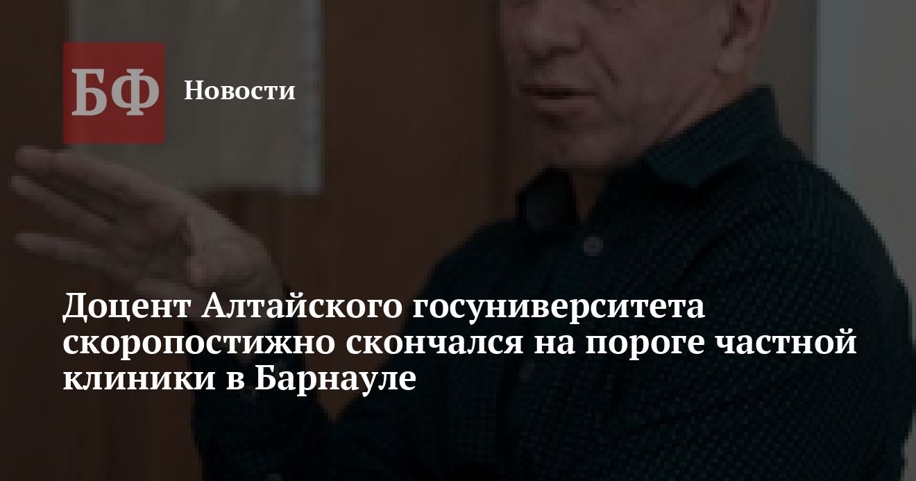 Институт социальных наук Алтайского государственного университета сообщил о том, что понес невосполнимую утрату — 10 октября скончался доцент кафедры общей социологии, кандидат философских наук Анатолий Домашев. В вузе отметили, что у него не выдержало сердце. Тем временем в соцсетях сообщили, что смерть настигла преподавателя на пороге барнаульской частной клиники, где ему якобы не успели оказать помощь. Официальные ведомства пока данную информацию не комментируют.
