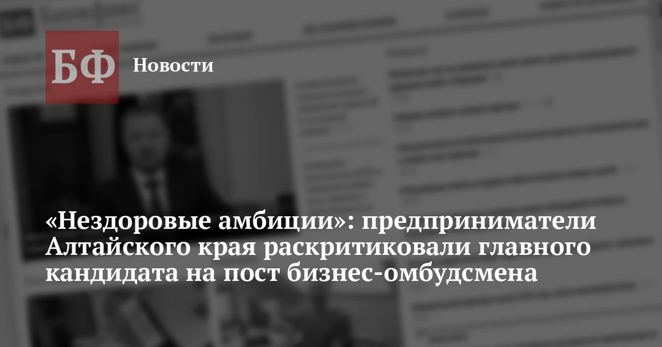 Часть бизнес-сообщества Алтайского края добивается рассмотрения других кандидатур на должность уполномоченного по защите прав предпринимателей вместо председателя комитета по правовой политике Алтайского Заксобрания Андрея Осипова, которого пока официально поддерживает правительство. Как пишет «Толк», 12 октября вице-губернатору региона Виталию Снесарю было направлено письмо с критикой претендента, а также с расширенным списком потенциальных кандидатов. Примечательно, что документ передал депутат АКЗС и бизнесмен Юрий Матвейко, который является председателем реготделения общественной организации предпринимателей «Деловая Россия», и в свою очередь ранее подвергся резкой критике со стороны Осипова.