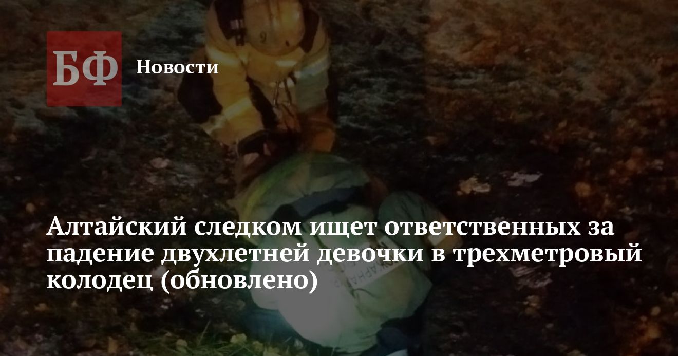 24 октября вечером в парковой зоне улицы Аванесова в Барнауле двухлетняя девочка провалилась в канализационный колодец глубиной около 3 м. Ребенок остался жив, однако получил серьезные травмы. Прибывшие на место спасатели оперативно извлекли девочку из ямы. В настоящее время СУ СКР по Алтайскому краю проводит доследственную проверку и устанавливает обстоятельства случившегося.
