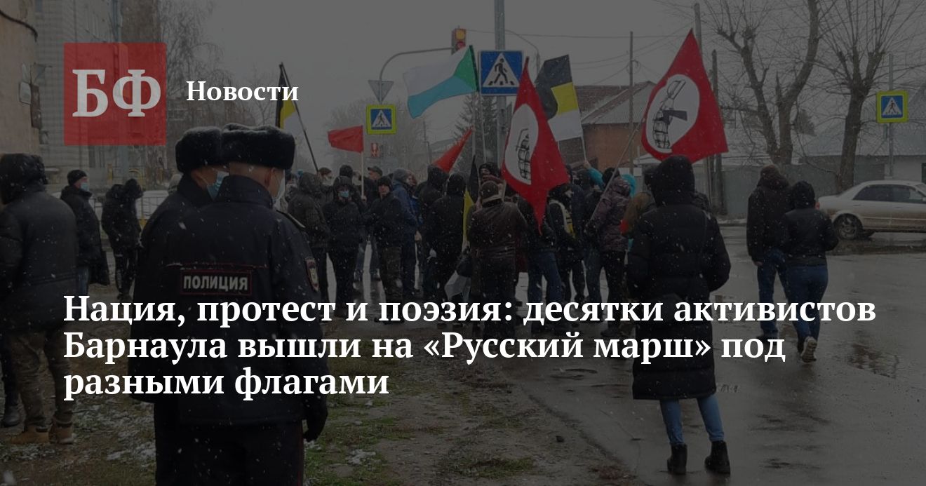 Погода в День народного единства в Барнауле была пасмурная, сырая и холодная, что не помешало собраться нескольким десяткам человек на пересечении улиц Петра Сухова и 80-й Гвардейской дивизии. К 13:00 большинство участников «Русского марша» уже пришли к запланированному месту встречи, где их ожидали сотрудники полиции, которые следили за порядком. В основной массе на мероприятие пришли националисты, но присутствовали и приверженцы других идеологических взглядов: либералы, сторонники СССР. В конце колонны была даже женщина с коляской, а в толпе поговаривали, что пришли и скандальные антимасочники, хотя в целом большинство людей соблюдали меры защиты.