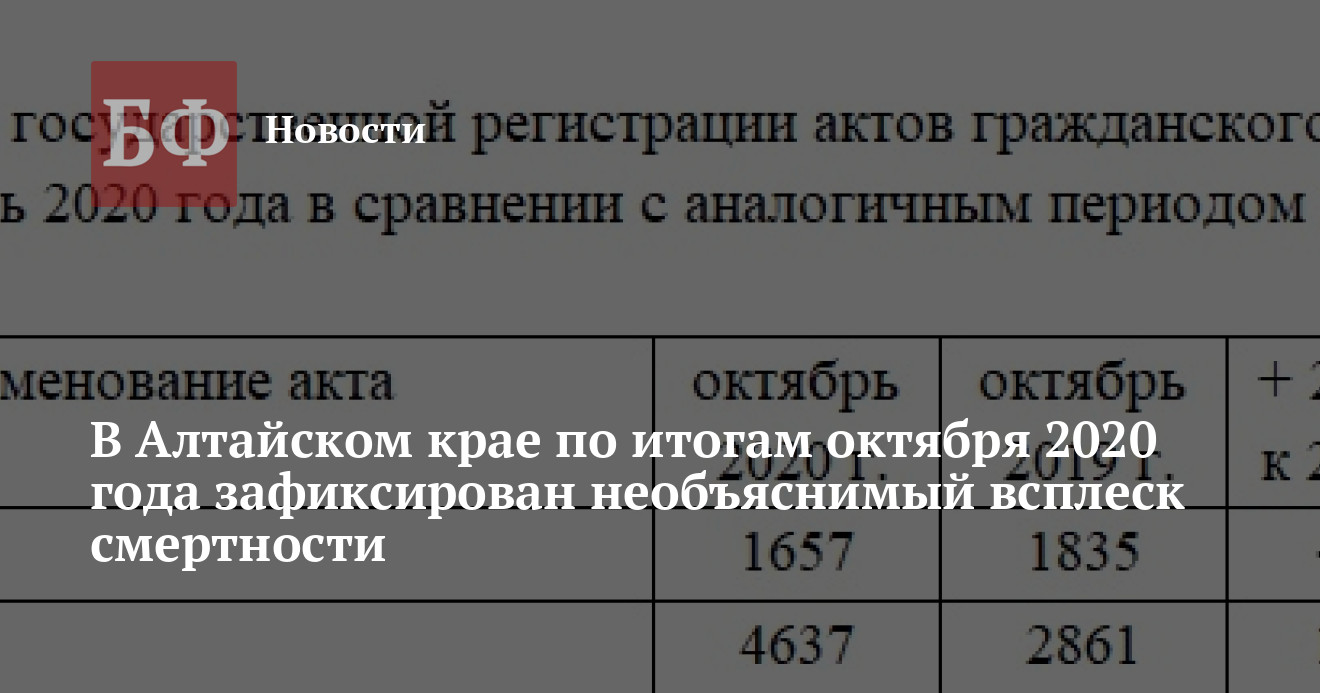 В соответствии со сведениями о государственной регистрации актов гражданского состояния, в октябре 2020 года в Алтайском крае было составлено 4637 актов о смерти, при том, что в октябре 2019 года был составлен только 2861 такой документ. Разница составляет 1776 актов. Если сравнивать два периода с января по октябрь — 2019 и 2020 года — то разница составит 1305 смертей в пользу текущего года (28 924 против 27 619 свидетельств о смерти).