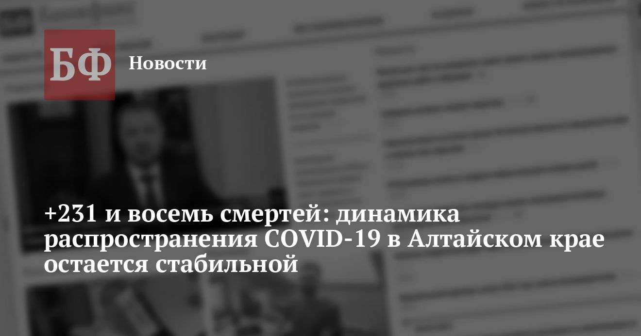В Алтайском крае за прошедшие сутки зарегистрировано 231 новый случай заболевания коронавирусной инфекцией, выздоровело 288 пациентов, сообщает региональный оперштаб. За день умерло восемь человек, от COVID-19 — четыре.