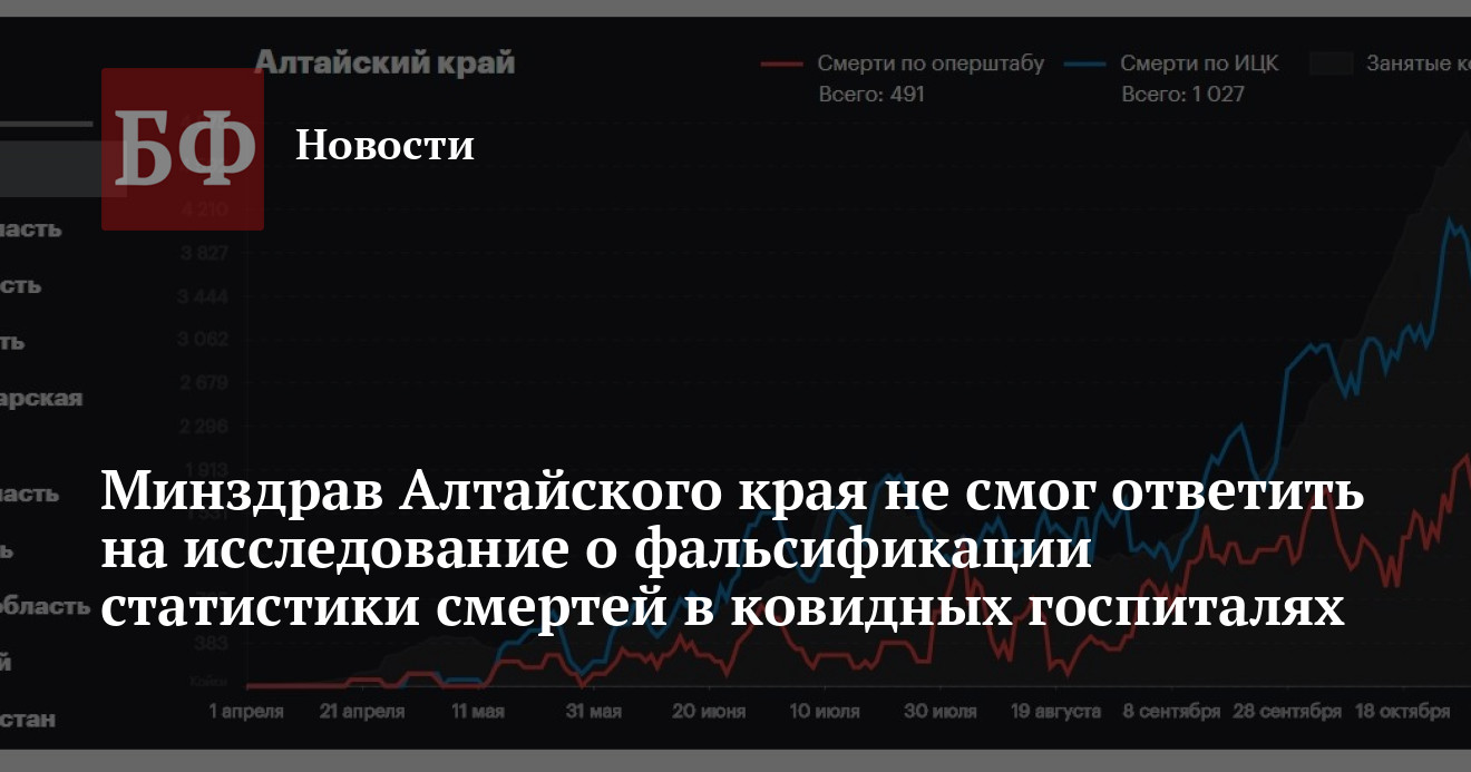 Официальные данные оперштаба Алтайского края и федерального портала «Стопкоронавирус» о числе смертей среди зараженных коронавирусом в регионе оказались занижены вдвое по сравнению с данными Информационного центра по мониторингу ситуации с коронавирусом (ИЦК). К такому выводу пришли портал «Медиазона» и редакция «Медузы"*, в руки которым попали документы Инфоцентра. В Минздраве Алтайского края никак не комментируют ситуацию, несмотря на то, что информация о расхождении появилась еще несколько дней назад, а СМИ запрашивали реакцию ведомства на это исследование.