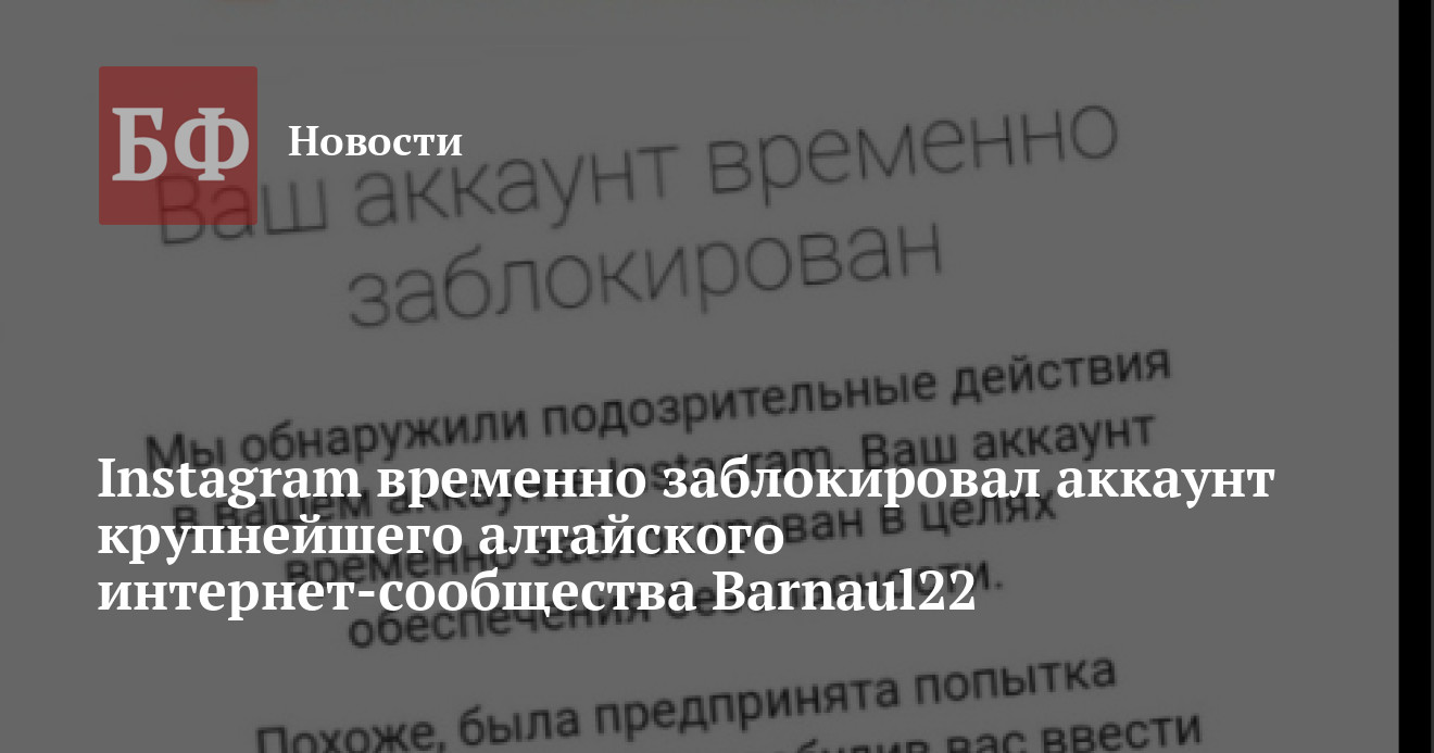 Администрация крупнейшего алтайского интернет-сообщества Barnaul22 потеряла доступ к своему аккаунту в Instagram из-за попытки его взлома. Судя по рассказу владельца сообщества Алексея Куреленка, речь идет о фишинговой атаке, которая, очевидно, оказалась успешной. При этом Куреленок рассказал, что подобным атакам якобы подвергаются и другие знакомые ему блогеры.
