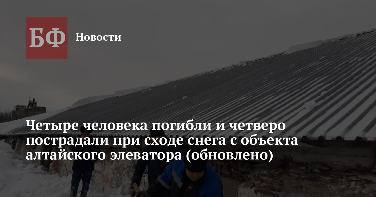 8 февраля в 10:00 на станции Смазнево в Заринском районе произошел сход снега с крыши зернохранилища, в результате чего пострадало несколько человек. По информации пресс-службы правительства Алтайского края, четыре работника погибли на месте происшествия, еще четверо получили травмы. Как уточнили ИА «Банкфакс» в ГУ МЧС по Алтайскому краю, речь идет о здании ОАО «Заринский элеватор». Спасатели и медики уже выехали на место событий. Губернатор Виктор Томенко взял ситуацию на контроль и отправил в Заринский район профильных чиновников.