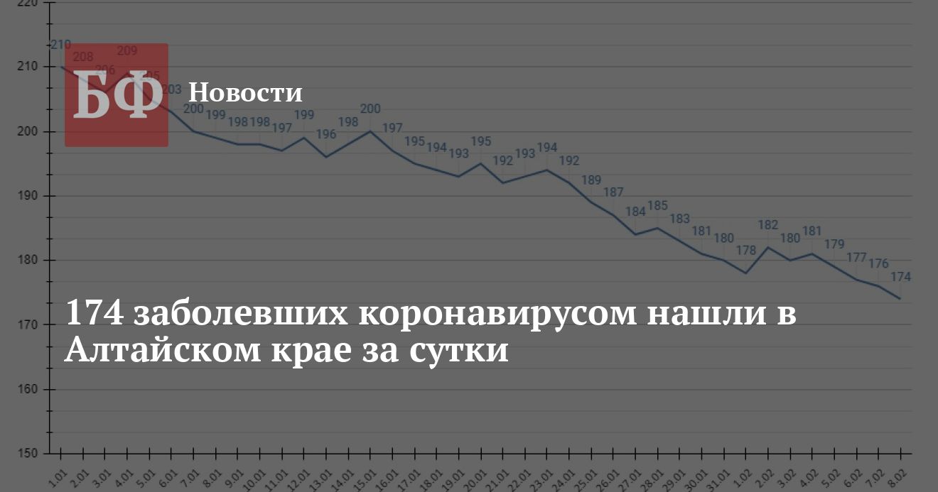 8 февраля по результатам обследования граждан 174 теста на ковид оказались положительными. По муниципалитетам: Барнаул — 48, Рубцовск — 16, Бийск — 14, Камень-на-Оби, Яровое — по семь, Ребрихинский район — шесть, Локтевский, Поспелихинский, Рубцовский, Тогульский районы — по пять, Бийский, Завьяловский районы — по четыре, Алейский, Ельцовский, Зональный, Красногорский, Советский, Тальменский, Топчихинский, Чарышский районы — по три, Алейск, Заринск, Алтайский, Курьинский, Мамонтовский, Павловский, Солонешенский, Целинный, Шелаболихинский, Шипуновский районы — по два, Благовещенский, Немецкий национальный, Новичихинский, Солтонский районы — по одному.