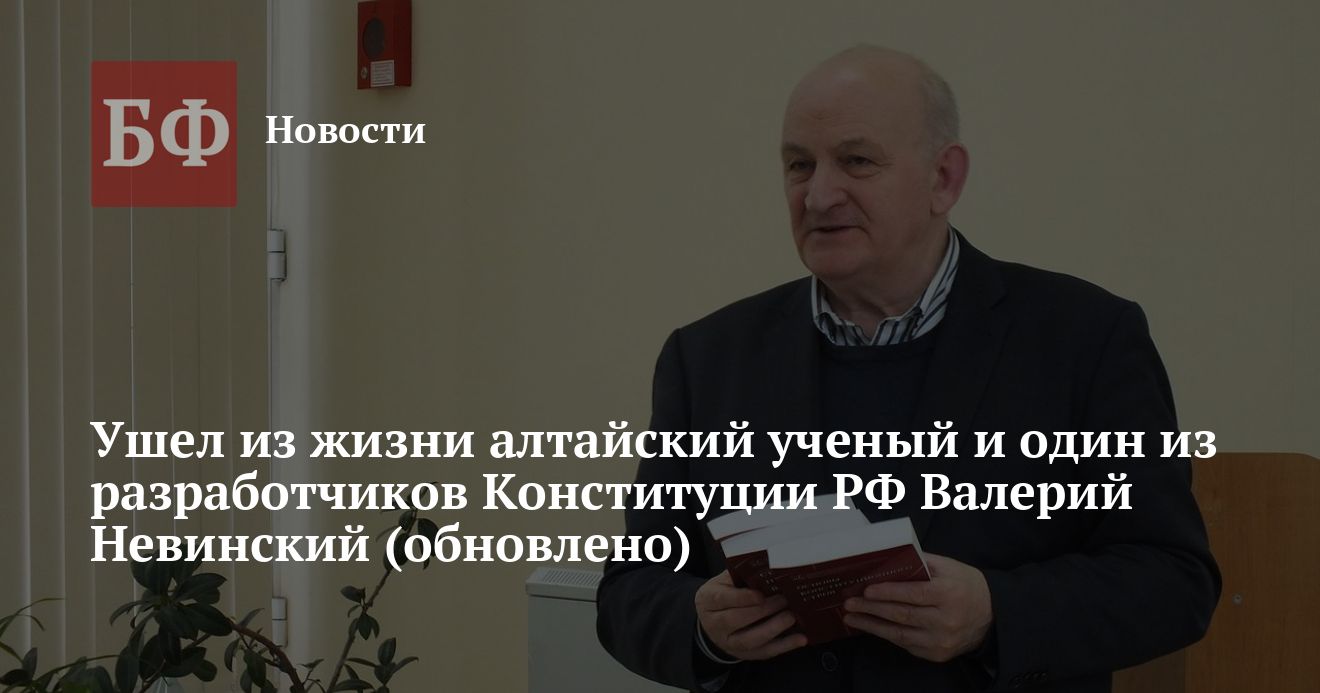 12 февраля стало известно о смерти известного ученого, заслуженного юриста России, профессора и экс-проректора Алтайского государственного университета, бывшего члена Общественной палаты края Валерия Невинского. Об этом сообщил его ученик, депутат Алтайского Заксобрания Александр Молотов. О времени и месте прощания с усопшим пока не известно.
