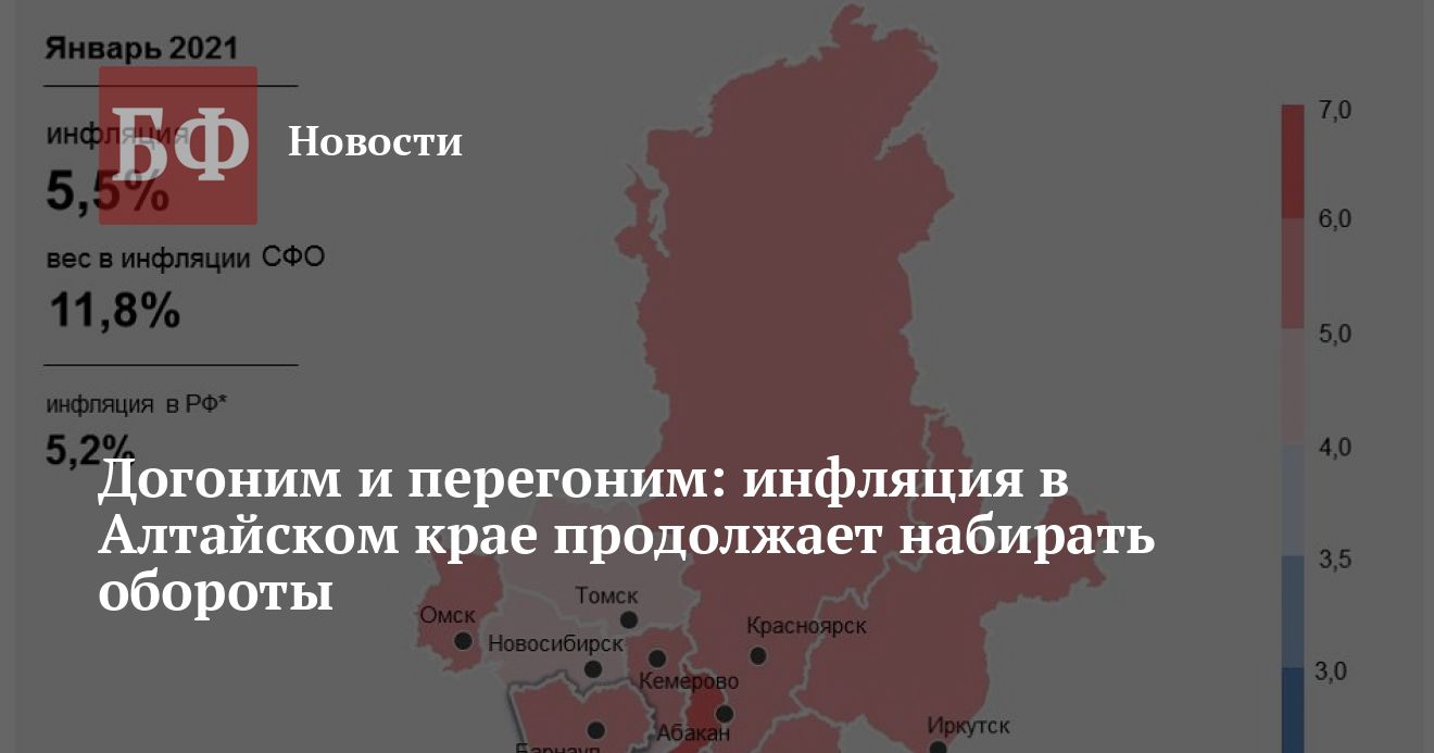 В январе годовая инфляция в Алтайском крае ускорилась на 0,1 п.п. — до 5,5%. Это выше, чем в целом по Сибирскому федеральному округу и по России (5,1% и 5,2% соответственно). Как пояснили в региональном отделении Центробанка РФ, повышение инфляции в значительной мере связано с продолжением действия кратковременных федеральных факторов: переносом в цены произошедшего ранее ослабления рубля, а также ростом спроса и снижением предложения на отдельных рынках товаров. Кроме того, сохраняет влияние основной региональный фактор ускорения инфляции — снижение урожая зерна по сравнению с прошлым годом. Таким образом, рост цен в регионе только набирает обороты.