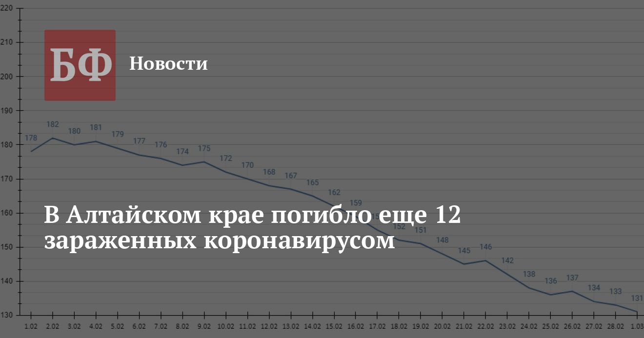 Из 131 нового случая 39 было зарегистрировано в Барнауле, 14 — в Бийске, 13 — среди жителей Рубцовска, семь — в Яровом, по пять — в Камне-на-Оби, Бийском и Поспелихинском районах, четыре — в Алейском районе, по три — в Заринске, Михайловском и Усть-Пристанском районах, по два — в Новоалтайске, Немецком национальном, Крутихинском, Павловском, Рубцовском, Солтонском, Топчихинском и Шипуновском районах, по одному — в Алейске, Благовещенском, Бурлинском, Егорьевском, Зональном, Калманском, Каменском, Ключевском, Краснощековском, Кулундинском, Локтевском, Новичихинском, Панкрушихинском и Родинском районах. С учетом этих цифр общее число случаев заражения достигло 43 797. Кроме того, за 1 марта было зарегистрировано еще 12 смертей среди инфицированных. За все время погибло 2 352 человека, все взрослые, из них 1 524 человек — непосредственно от COVID-19, а еще 828 человек — по иным причинам. Общее число выздоровевших — 39 102 человека.