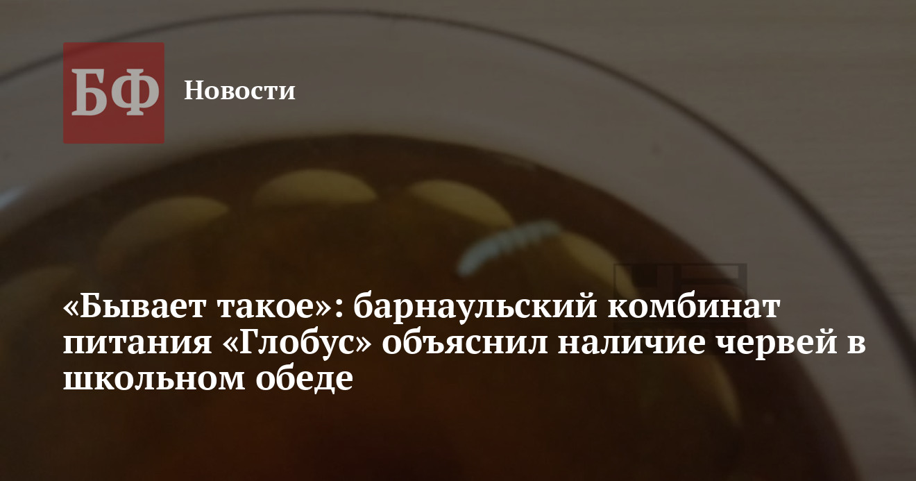 Представители комбината школьного питания «Глобус» прокомментировали претензии родителей по поводу обедов в барнаульской гимназии № 123. Там в одной из порций компота обнаружили червя, фото которого быстро распространились в Сети. Руководитель КШП Евгений Скурлатов в разговоре с «Банкфаксом» сказал, что не собирается отпираться и просит прощения у родителей и детей от лица коллектива за эту оплошность. При этом сам он придерживается мнения, что червь в еде был абсолютно безвреден, да и вообще свидетельствовал о качестве используемого сырья.