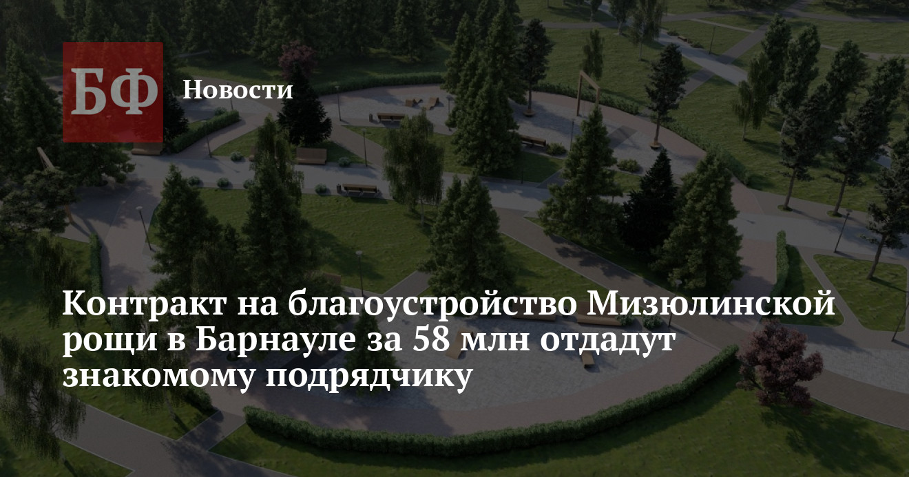 Стала известна компания, которая займется возрождением барнаульской Мизюлинской рощи в 2021 году. По результатам тендера, контракт более чем на 58 млн рублей заключат с ООО «СК Город». За последние пару лет этот подрядчик стал одним из основных партнеров мэрии в исполнении «плиточно-озеленительного» благоустройства общественных пространств по нацпроекту.
