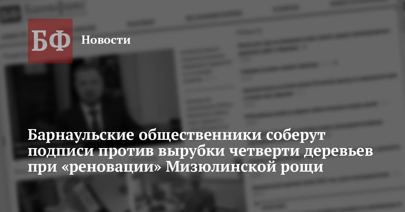 Благоустройство Мизюлинской рощи в Барнауле, которое обойдется бюджету в 58 млн рублей, обернется вырубкой четверти всех деревьев на этой территории, следует из документации на сайте Госзакупок. Взамен планируют посадить лишь небольшие саженцы, в выживании которых у наблюдателей возникают большие сомнения, а значительную площадь замостят плиткой. Такая ситуация возмутила группу «зеленых» активистов, которые намереваются инициировать сбор подписей против такого подхода к благоустройству.