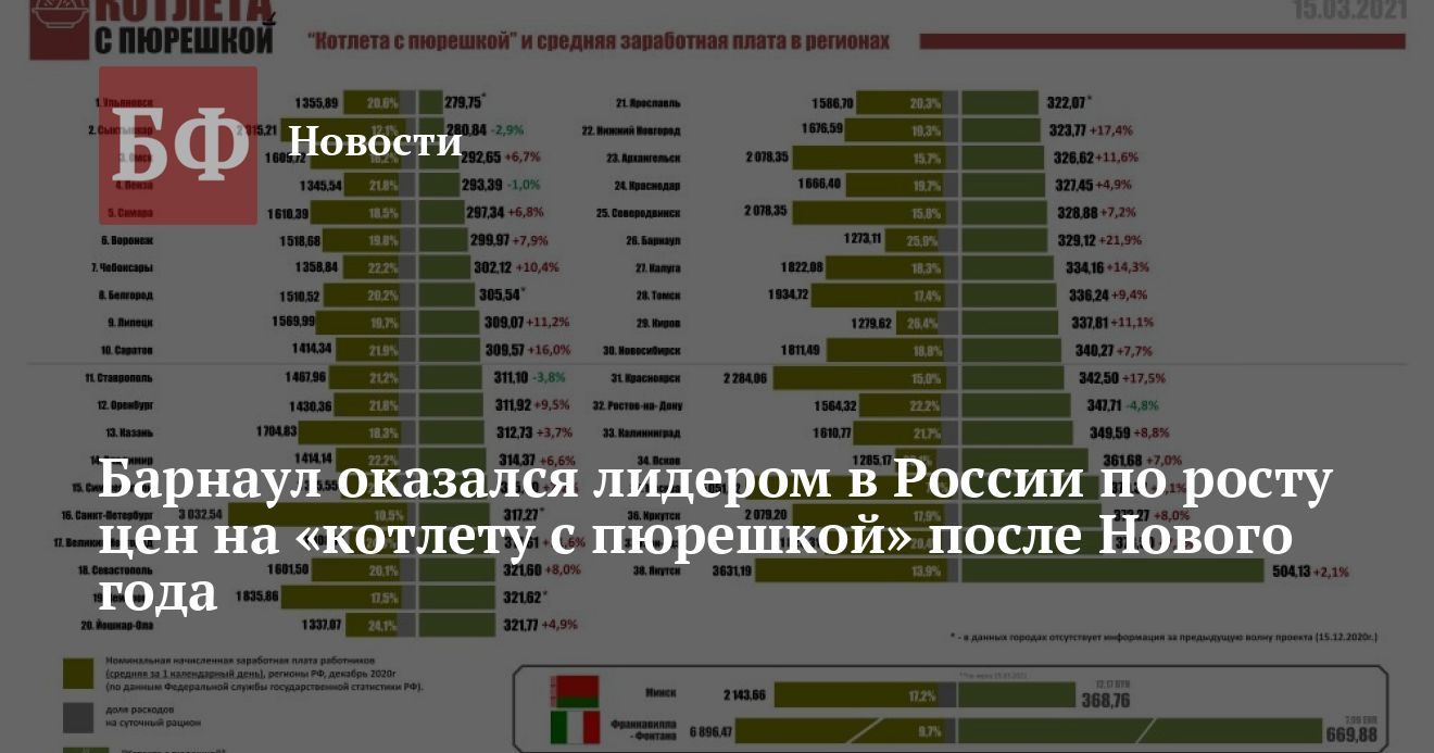 По данным издания, мониторинг цен провели в рамках общероссийского некоммерческого проекта «Котлета с пюрешкой» 15 марта 2021 года. Члены сети региональных исследовательских компаний «Полстеры.рф» обошли магазины федеральных и местных торговых сетей в 38 российских регионах. В рамках проекта каждый квартал фиксируют розничные цены на три десятка продуктов. Выбирают самые дешевые товары в минимальной фасовке (не пересчитывая на килограмм). Состав корзины «котлета с пюрешкой» всегда один — это ингредиенты для условного рациона на сутки. Завтрак — овсянка на молоке с яблоком, бутерброд с маслом и сыром, кофе с молоком и пол-апельсина. Обед — салат из свежих овощей, борщ, котлета из свиного фарша с картофельным пюре, чай и хлеб. Ужин — салат оливье, макароны с поджаркой из курицы, чай и хлеб.