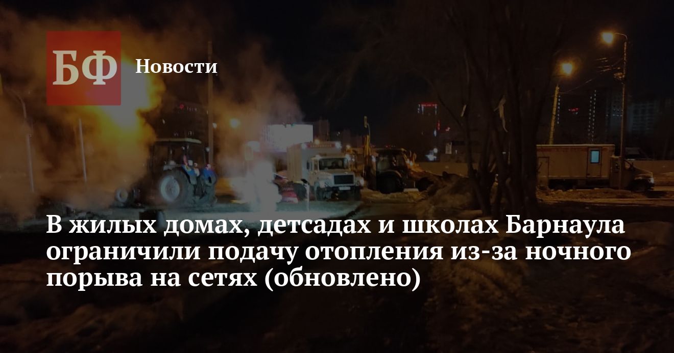 Порыв на теплосети диаметром 426 мм произошел в 3:50 возле дома на улице Попова, 118. Авария повлекла за собой выход жидкости на поверхность. Подачу горячей воды и отопления в итоге ограничили для 24 многоквартирных домов: на улице Попова, 98, 98 «А», 100, 102, 106, 108, 114, 118, улице Антона Петрова, 235, 237, 239, 241, улице Энтузиастов, 28, 32, 34, 36, 38, 40, Солнечной Поляне, 35, 37, 43, 45, 49, 55. Кроме того, под ограничения попали четыре детских сада (№ 229, № 231, № 223 и № 224), две школы (№ 117 и № 120), а также школа-интернат на Солнечной Поляне, 53. Сотрудники АО «Барнаульская теплосетевая компания» всю ночь проводили земляные работы с привлечением семи единиц техники. Об обнаружении повреждения власти сообщили после 8:30. Сейчас работникам предстоит провести сварочные работы, время окончания которых неизвестно.