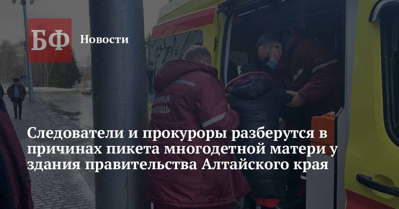 По поручению и.о. прокурора Алтайского края Александра Фомина в Барнауле организовали проверку возможного нарушения прав многодетной семьи. Об этом ведомству стало известно из публикаций СМИ о госпитализации матери четверых детей Елены Воронцовой после одиночного пикета в Барнауле. Женщина пыталась обратить внимание властей на свою проблему, но когда стояла с плакатом на площади, почувствовала себя плохо и оказалась в больнице. Свою проверку организовал и алтайский следком. Тем временем правительство региона прокомментировало требования активистки, объяснив, почему местные власти не могут оперативно исполнить свои обязательства перед многодетными семьями.