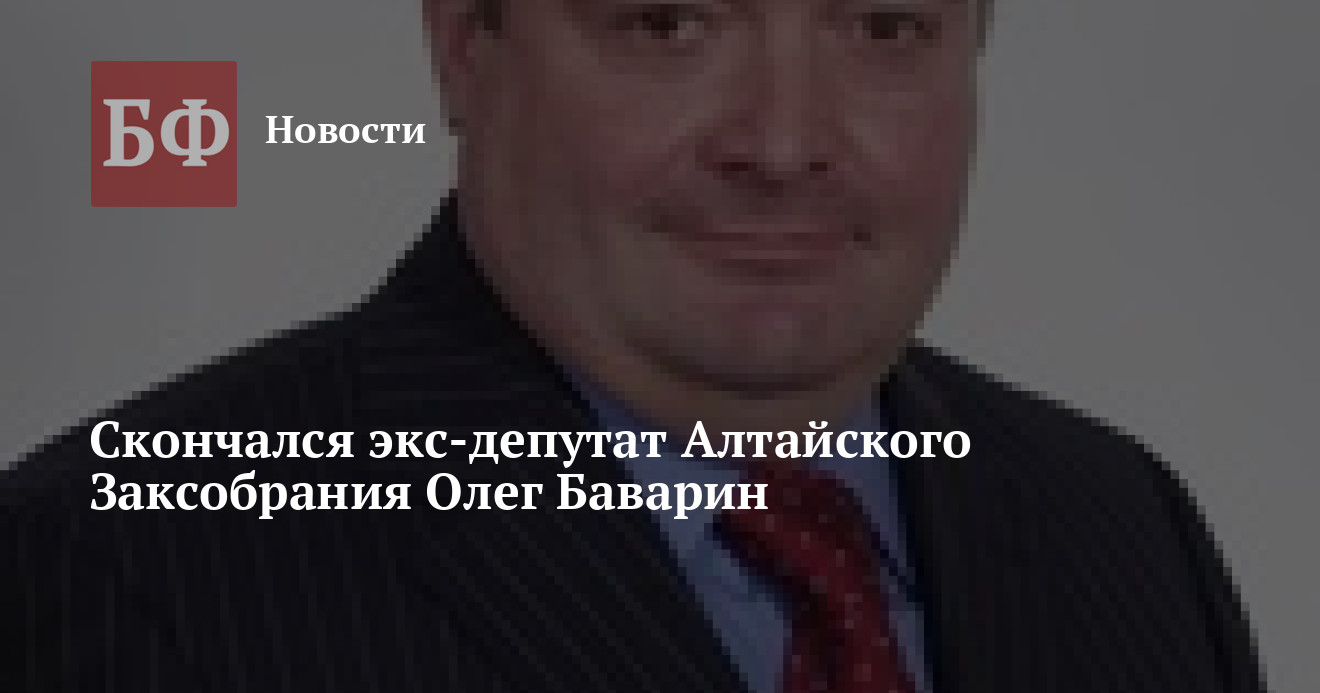 Депутат Алтайского Заксобрания четвертого и пятого созывов Олег Баварин скончался на 57-м году жизни. Прощание пройдет 29 марта 2021 года с 11:30 до 13:00 в ритуальном зале по улице Аносова, 8 в Барнауле, информирует пресс-служба АКЗС.