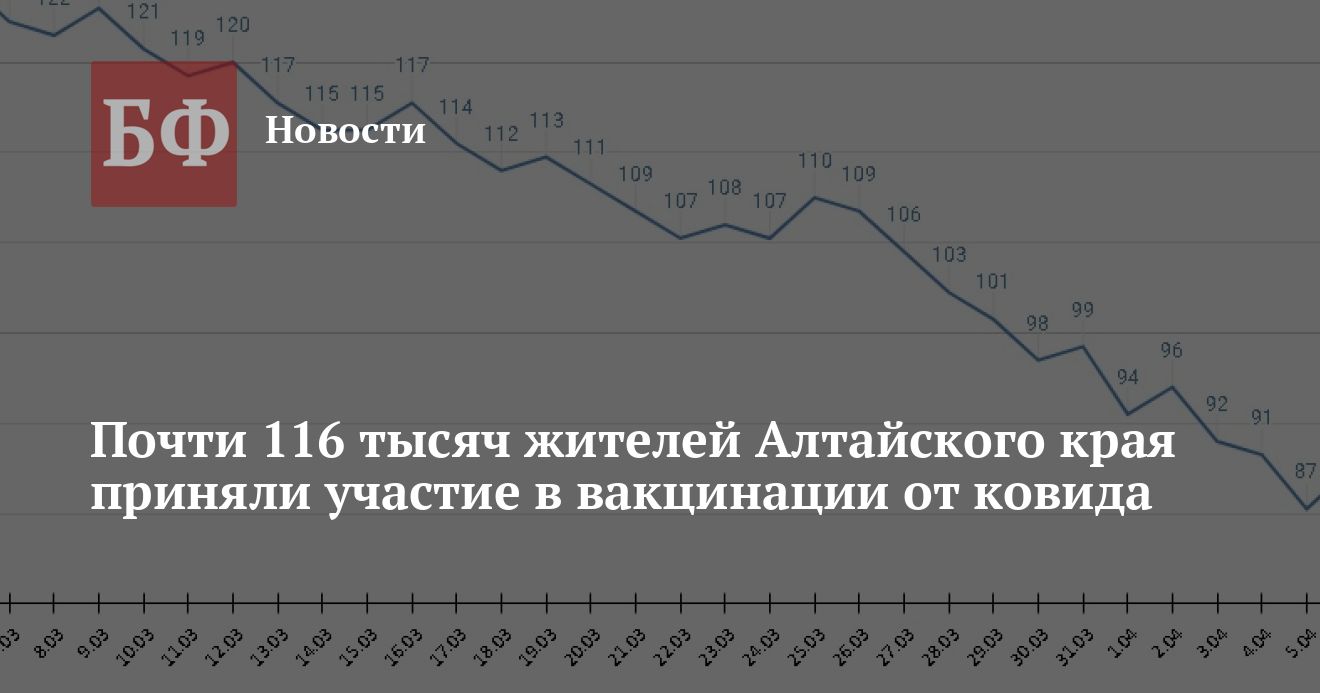 Общее количество поставленной вакцины в Алтайский край составило 143 517 комплектов (компонент I + компонент II) комбинированной векторной вакцины для профилактики коронавирусной инфекции, вызываемой вирусом SARS-COV-2 «Гам-Ковид-Вак» для иммунизации взрослого населения, в первую очередь из групп риска заражения. На утро 8 апреля прививается 115 913 (+4772) человек, в том числе: 42 759 человек получили первую прививку; 73 154 человека полностью привиты (получили две прививки).