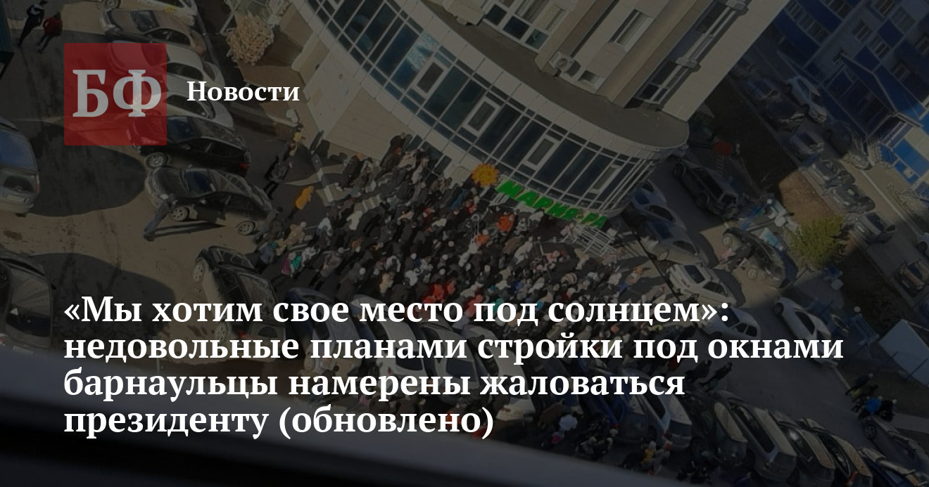 Больше 100 барнаульцев вышли обсудить план противодействия перспективе возведения еще одной многоэтажки на крошечном участке между их домами на улице Гущина, 157 «А», 150/3 и 150/4. Как следует из их видеообращения, опубликованном в официальном Telegram-канале алтайского крайкома КПРФ, люди намереваются жаловаться президенту РФ Владимиру Путину из-за сложившейся ситуации.