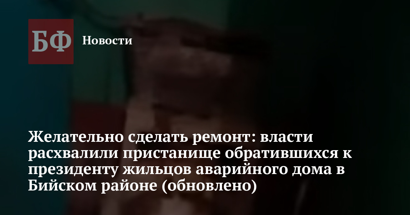 Администрация Бийского района утверждает, что общежитие в селе Первомайское, куда настойчиво просят переехать жителей аварийного жилья, подлежащего сносу, находится в удовлетворительном состоянии, и ремонт ему почти не требуется. Об этом ИА «Банкфакс» поведал замглавы района Юрий Анищенко в ответе на запрос. Ранее недовольные предлагаемыми условиями проживания граждане записали видеообращение в адрес президента Владимира Путина, в котором рассказали, что их переселяют в барак без туалетов и с фанерными окнами. Между тем под контролем главы СК РФ Александра Бастрыкина краевой следком инициировал проверку, которая в том числе коснется чиновников, чьи действия проверят на предмет халатности.