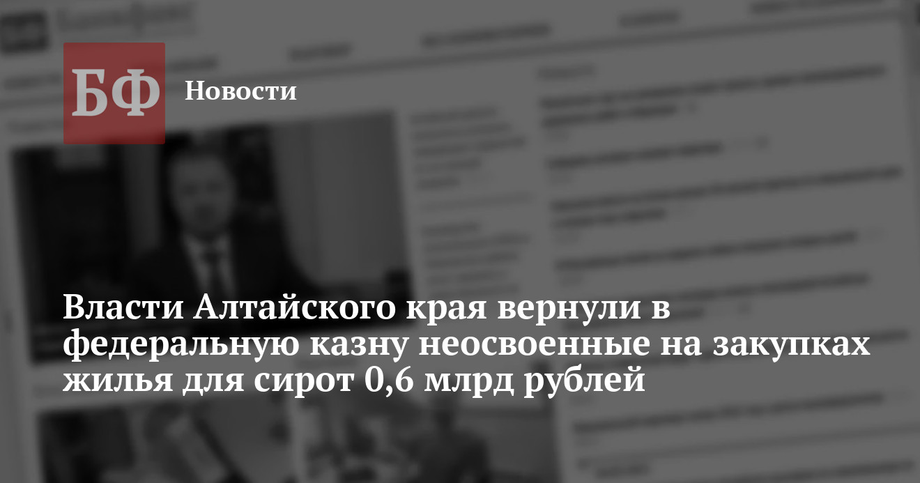 Почти 600 млн рублей, которые были выделены Алтайскому краю из бюджета РФ в 2020 году на обеспечение жильем детей-сирот, вернулись в федеральную казну, так как региональные чиновники не смогли их освоить. Об этом сообщает ТАСС со ссылкой на пресс-службу краевого Минстроя ЖКХ.