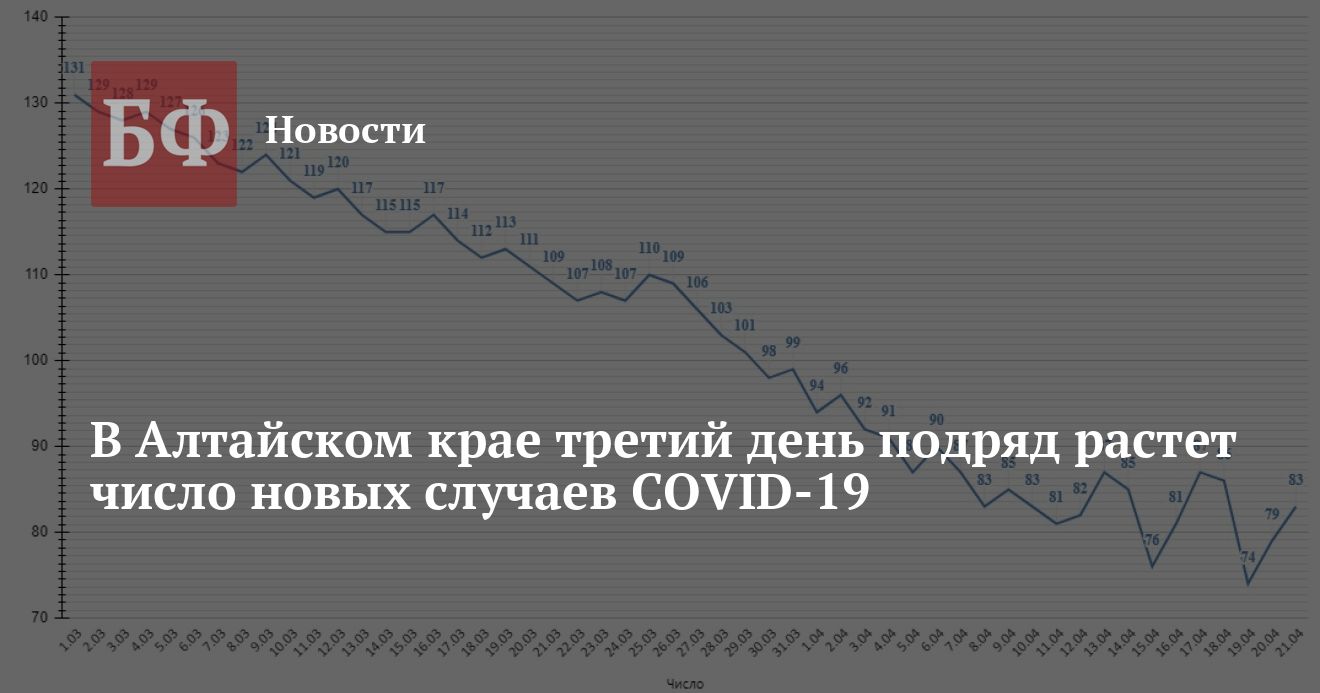 Из 83 новых случаев заражения 27 было зарегистрировано в Барнауле, 12 — в Бийске, по четыре — среди жителей Рубцовска, Бийского и Поспелихинского районов, по три — в Заринске, Яровом, Локтевском и Третьяковском районах, по два — в Крутихинском, Советском и Усть-Калманском районах, по одному — в Алейске, Камне-на-Оби, Новоалтайске, Алтайском, Благовещенском, Бурлинском, Змеиногорском, Зональном, Калманском, Новичихинском, Суетском, Троицком, Хабарском и Шипуновском районах. С учетом этих цифр, общее число заразившихся коронавирусом в регионе достигло 49 025. Выздоровели всего 43 962 человека. Погибло за все время 2906 человек, из них 2016 (в том числе восемь за последние сутки) — непосредственно от COVID-19, а еще 890 — по иным причинам.