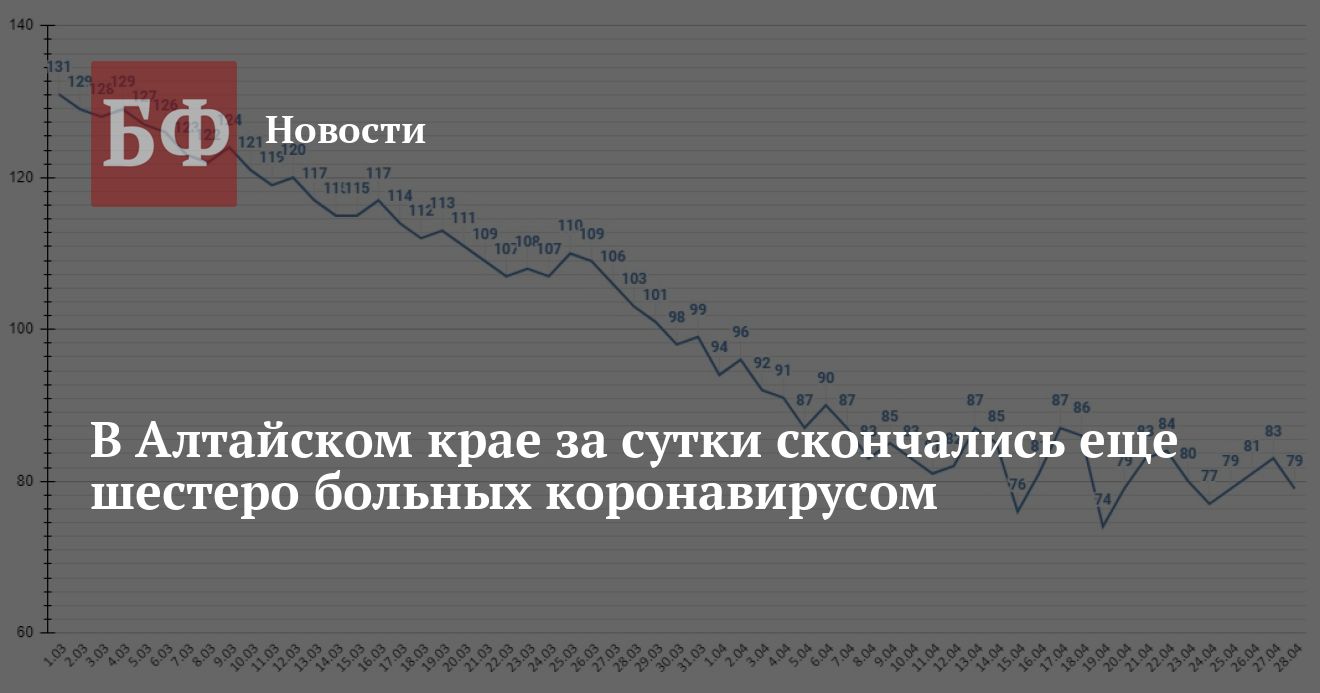 Из 79 новых случаев 26 было выявлено в Барнауле, 10 — среди жителей Бийска, девять — в Рубцовске, четыре — в Родинском районе, три — в Камне-на-Оби, по два — в Славгороде, Смоленском, Бийском, Павловском, Ребрихинском и Третьяковском районах, по одному — в ЗАТО Сибирском, Новоалтайске, Баевском, Благовещенском, Бурлинском, Залесовском, Заринском, Зональном, Калманском, Крутихинском, Локтевском, Немецком национальном, Табунском, Хабарском и Целинном районах. В общей сложности в регионе за весь период пандемии заразилось 49 588. Выздоровело 44 442 человека. Умерло 2957 человек, в том числе шестеро — за последние сутки. Из них 2058 человек погибли непосредственно от COVID-19, а еще 899 — по иным причинам.