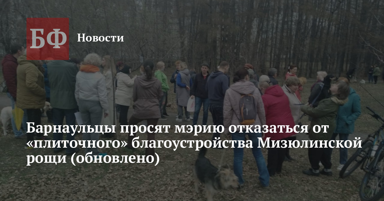 UPD 11:25: Проект благоустройства Мизюлинской рощи будет существенно переделан, договорились местные жители и администрация города. Об этом сообщил Telegram-канал «Ленина, 59-А», опубликовавший фото приехавшего на встречу с местными жителями председателя комитета по дорожному хозяйству, благоустройству, транспорту и связи Барнаула Антона Шеломенцева.