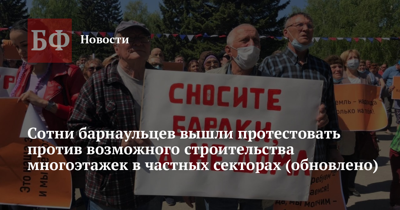 UPD 12:07: После публикаций об акции протеста прокуратура начала проверку в связи с требованиями жителей Барнаула о внесении изменений в Генплан и ПЗЗ города. Барнаульцы не согласны с внесенными в генеральный план краевого центра изменениями в части функциональной зоны указанной территории с индивидуальной жилой застройки на многоэтажную. В рамках проверочных мероприятий будет дана оценка соблюдения градостроительного и жилищного законодательства при внесении изменений в Генплан города. В случае выявления нарушений закона будет принят исчерпывающий комплекс мер прокурорского реагирования для их устранения, информирует надзорное ведомство.