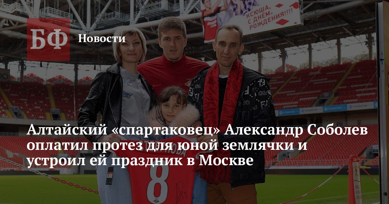На минувшей неделе девочка с родителями прибыла в Москву из села Верх-Катунское Бийского района, чтобы установить протез. Александр Соболев пригласил семью Стебуновых на «Открытие Банк Арену». Недавно у девочки был день рождения, поэтому футболист постарался сделать встречу незабываемой. Спортсмен провел ей экскурсию по музею «Спартака», а после гости отправились в зал для пресс-конференций, где Соболев вручил Ксюше подарок — именную футболку со своим автографом. Затем ее ждал еще один сюрприз: на табло стадиона она увидела поздравление «С Днем рождения». Не обошлось и без праздничного торта для именинницы в спартаковском спортбаре.