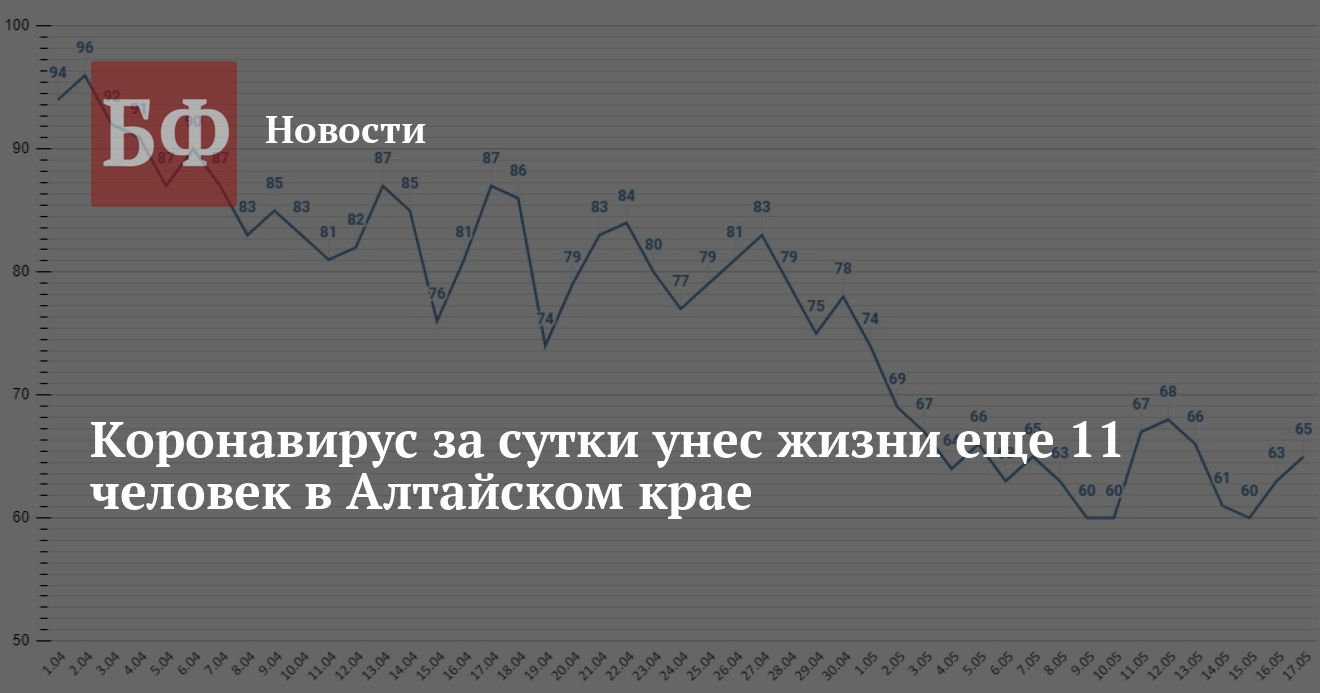 Из 65 новых случаев 20 было выявлено среди жителей Барнаула, 14 — в Бийске, пять — в Яровом, четыре — в Ключевском районе, три — в Рубцовском районе, по два — в Камне-на-Оби и Смоленском районе, по одному — в Славгороде, Рубцовске, Бийском, Волчихинском, Зональном, Косихинском, Локтевском, Павловском, Первомайском, Солтонском, Топчихинском, Третьяковском, Целинном, Чарышском и Шипуновском районах. С учетом этих цифр общее число заразившихся в Алтайском крае достигло отметки в 50 842 человека. Выздоровело всего 45 808 человек. Погибло 3119 человек, из них 2198 — непосредственно от COVID-19 (в том числе 11 - за последние сутки), а 921 — по иным причинам.