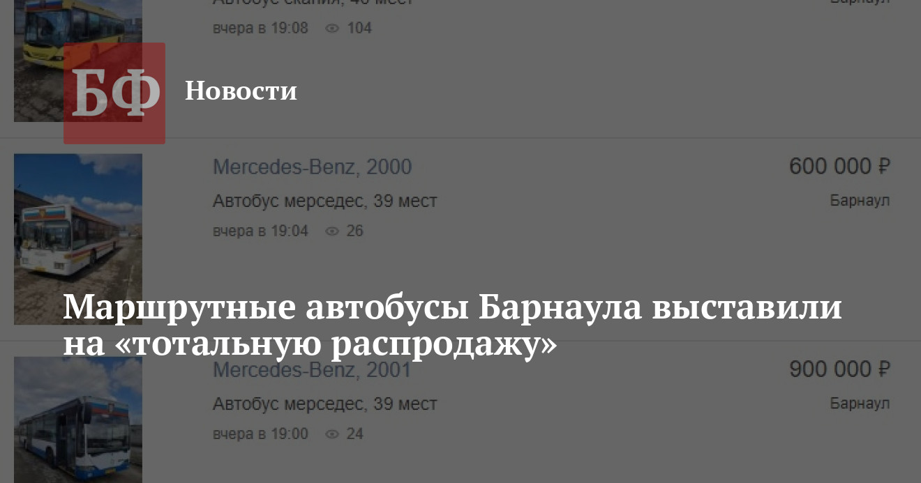 Объявления о продаже трех автобусов — двух Mercedes и одного Scania — были опубликованы 18 мая. Их возраст разнится от 21 года до 14 лет. Стоимость — от 600 тысяч до 1,5 млн рублей. В описании указано, что продавца интересует как продажа, так и обмен. Судя по опубликованным фотографиям, все три автобуса обслуживают барнаульский маршрут № 57. Один из предпринимателей, занимающийся пассажирскими перевозками, обращался по объявлению. Он рассказал «Банкфаксу», что продавец предлагает не только три указанные машины, а дает возможность выбирать более чем из 40 единиц техники — в основном это Mercedes и Scania. По указанным телефонам подтвердили, что автобусы и сейчас ходят по маршрутам. Их состояние, по его словам, идеальное, техника не требует вложений.